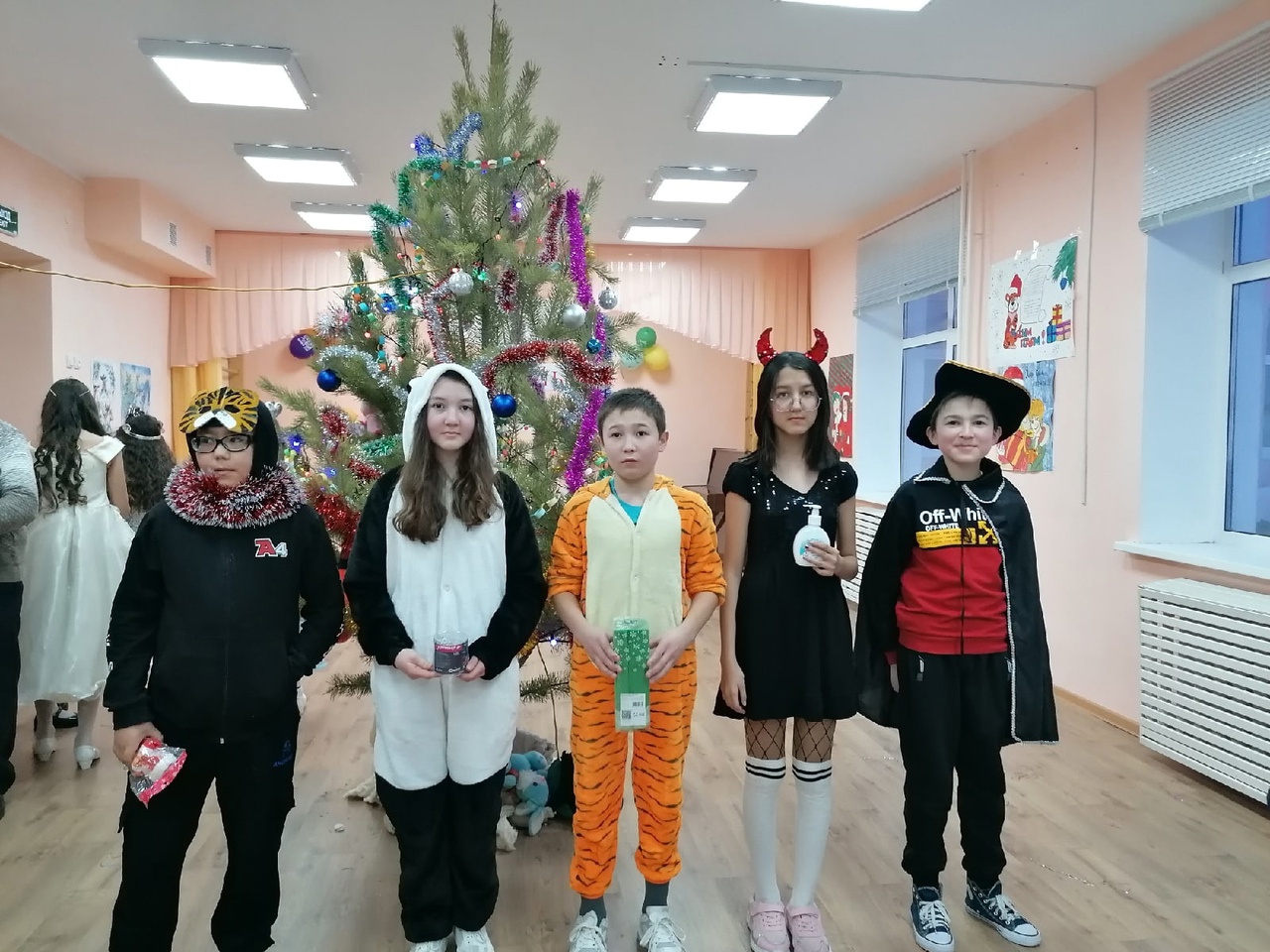 В преддверии Нового года в нашей школе прошли разные конкурсы: оформление кабинетов, снежные фигуры, изготовление ёлок из подручных средств и конкурс стенгазет. Также прошли новогодние утренники. Учащиеся пришли на елку, нарядившись в карнавальные костюмы. Они были в нарядах принцесс, разных зверей, бэтменов и других сказочных героев. В актовом зале их ждала огромная новогодняя елка, а развлекали детей сказочные персонажи: дед Мороз, Снегурочка, Баба Яга, коза и тигр.